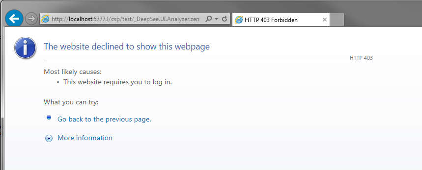 Tanto si accedes a DeepSee por primera vez como si estás configurando DeepSee en una instancia nueva, puedes encontrar dos incidencias habituales después de hacer clic en la opción "DeepSee" en el Portal de Administración del Sistema.