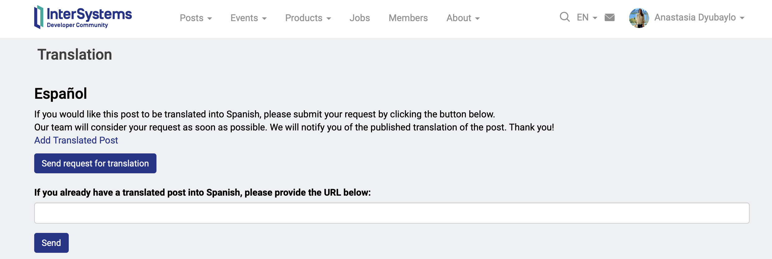 Ahora, cualquiera puede añadir o solicitar la traducción de una publicación de la Comunidad. Si quieres añadir una traducción, elige el idioma en el "Botón de idioma" y solicita permiso al autor. O, si ya tienes la traducción hecha, puedes añadir la URL directamente: