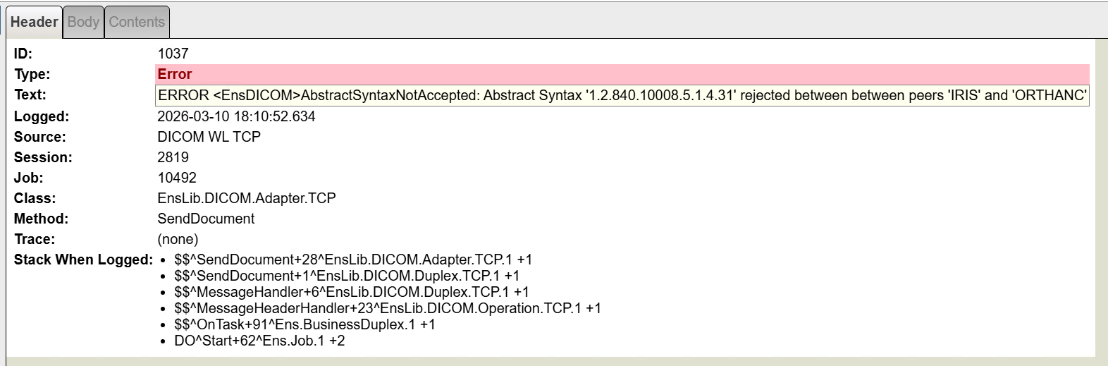 ERROR <EnsDICOM>AbstractSyntaxNotAccepted: Abstract Syntax '1.2.840.10008.5.1.4.31' rejected between between peers 'IRIS' and 'ORTHANC'