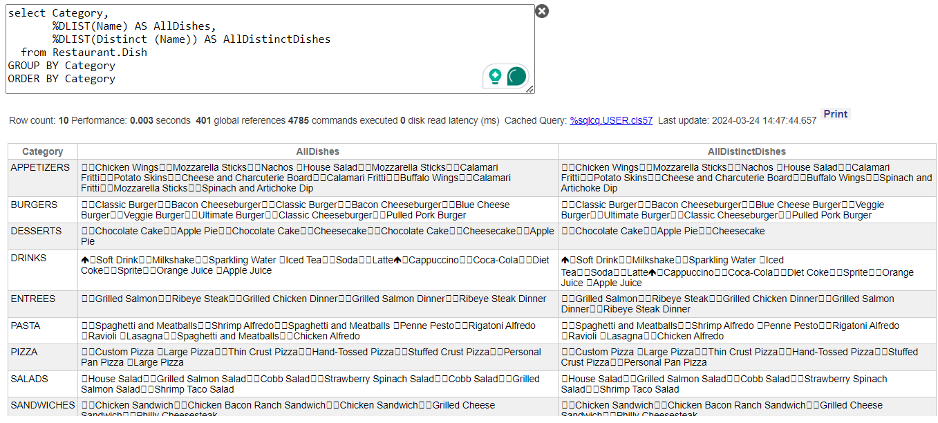 %DLIST(Name) AS AllDishes,
