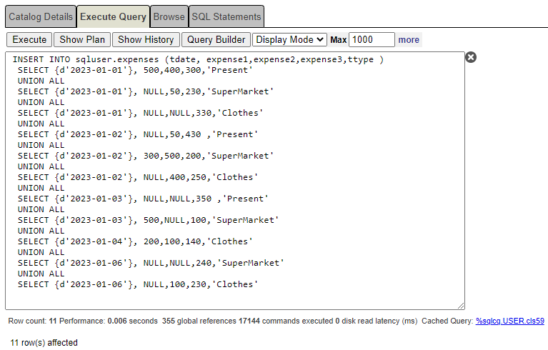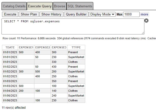 INSERTINTO sqluser.expenses (tdate, expense1,expense2,expense3,ttype )
