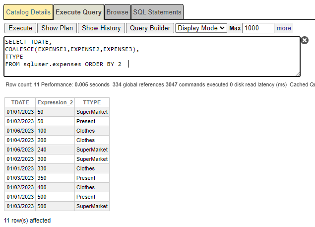 Ahora, al usar la función COALESCE recuperaremos el primer valor not NULL (no nulo) de las columnas expense1, expense2 y expense 3