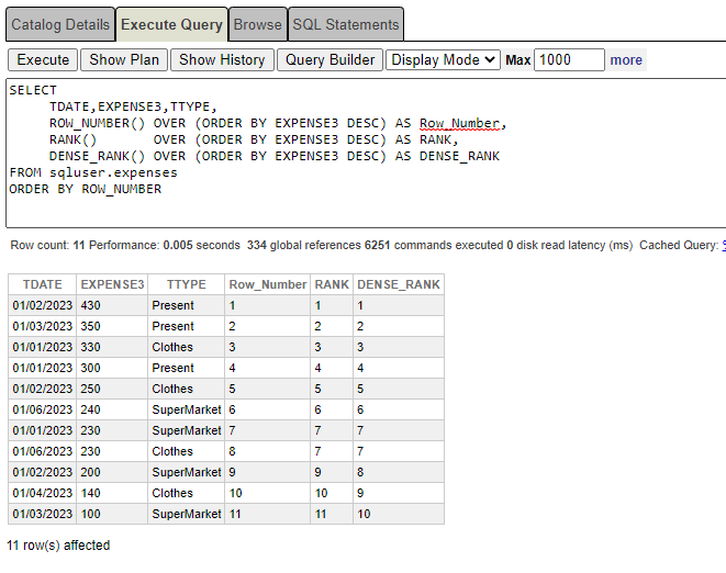 Queremos saber donde gasto más dinero y para ello tenemos diferentes formas de hacerlo. Podemos usar las tres funciones: ROW_NUMBER() , RANK() y DENSE_RANK() . Ordenaremos la tabla anterior usando las tres funciones y veremos las diferencias entre ellas usando la siguiente consulta: