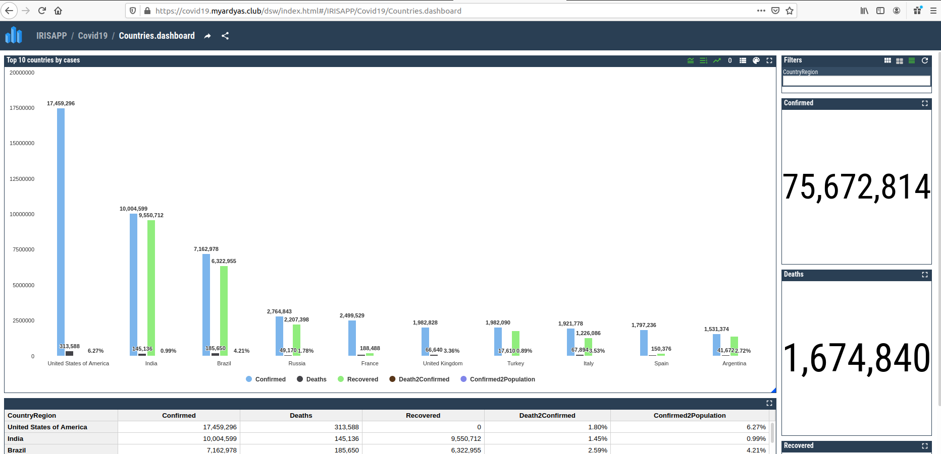 $ kubectl apply -f ingress.yamlDespués de un minuto, más o menos, IRIS debería estar disponible enhttp://covid19.myardyas.club/csp/sys/UtilHome.csp (recuerda utilizar tu nombre de dominio) y la aplicación COVID-19 enhttp://covid19.myardyas.club/dsw/index.html (selecciona el namespace IRISAPP).