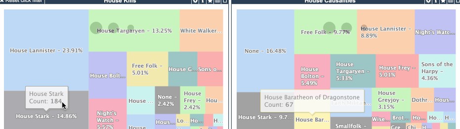 Lo que me ha sorprendido es que la Casa Stark ha matado a más soldados Lannister que viceversa: 34 Vs. 14.