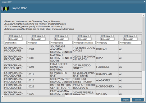 Haz clic en Next (siguiente) para obtener una vista previa de los datos y selecciona Measure (medida) o Dimension (dimensión):