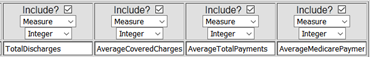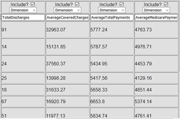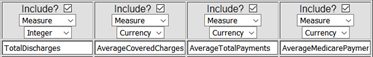 Aquí podemos ver que TotalDischarges (altas totales), AverageCoveredCharges (cargos cubiertos promedio), AverageTotalPayments (pagos totales promedio) y AverageMedicarePayments (pagos de Medicare promedio) serían buenos valores para agregar. Los convertiremos en medidas: