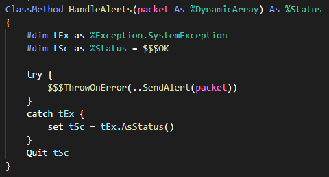 Así que en mi sencillo ejemplo, el administrador de alertas es una clase SAM.AlertHandler con subclases %SAM.AbstractAlertsHandler. La implementación del método HandleAlerts() es sencilla. Mira el código completo:
