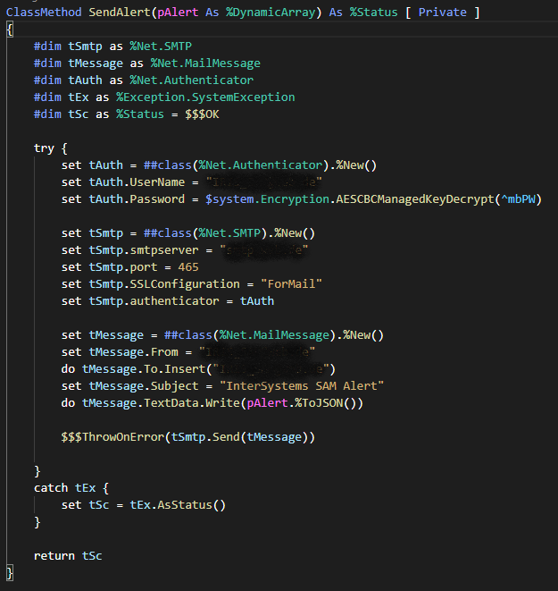 Delega el trabajo al método SendAlert. Asume que tienes una cuenta de correo electrónico de usuario, que puedes utilizar para las alertas. La contraseña del correo electrónico se almacena en la base de datos, pero la contraseña se encripta utilizando la función de InterSystems IRIS para el encriptado de "elementos de datos". Por lo tanto, tienes que crear una clave de encriptación en el SAM Manager y esta clave se debe cargar. De lo contrario, el administrador de alertas no podrá enviar el correo electrónico. Mi proveedor de correo electrónico requiere SSL/TLS para enviar el correo electrónico. He definido una configuración SSL ForMail en la instancia de SAM Manager. El resto del código es sencillo. Mira el código: