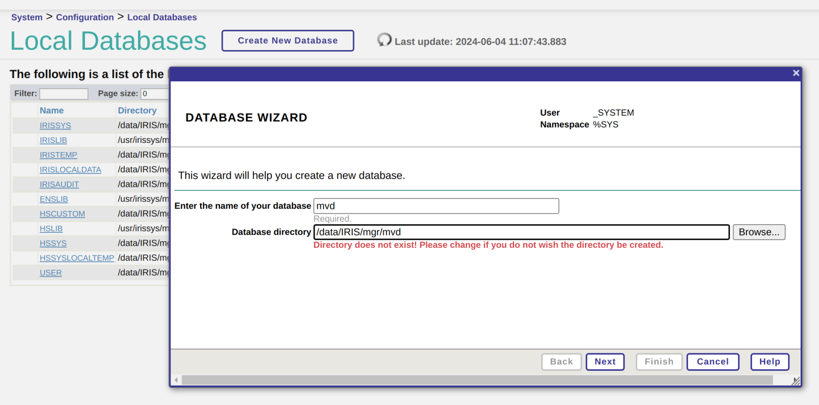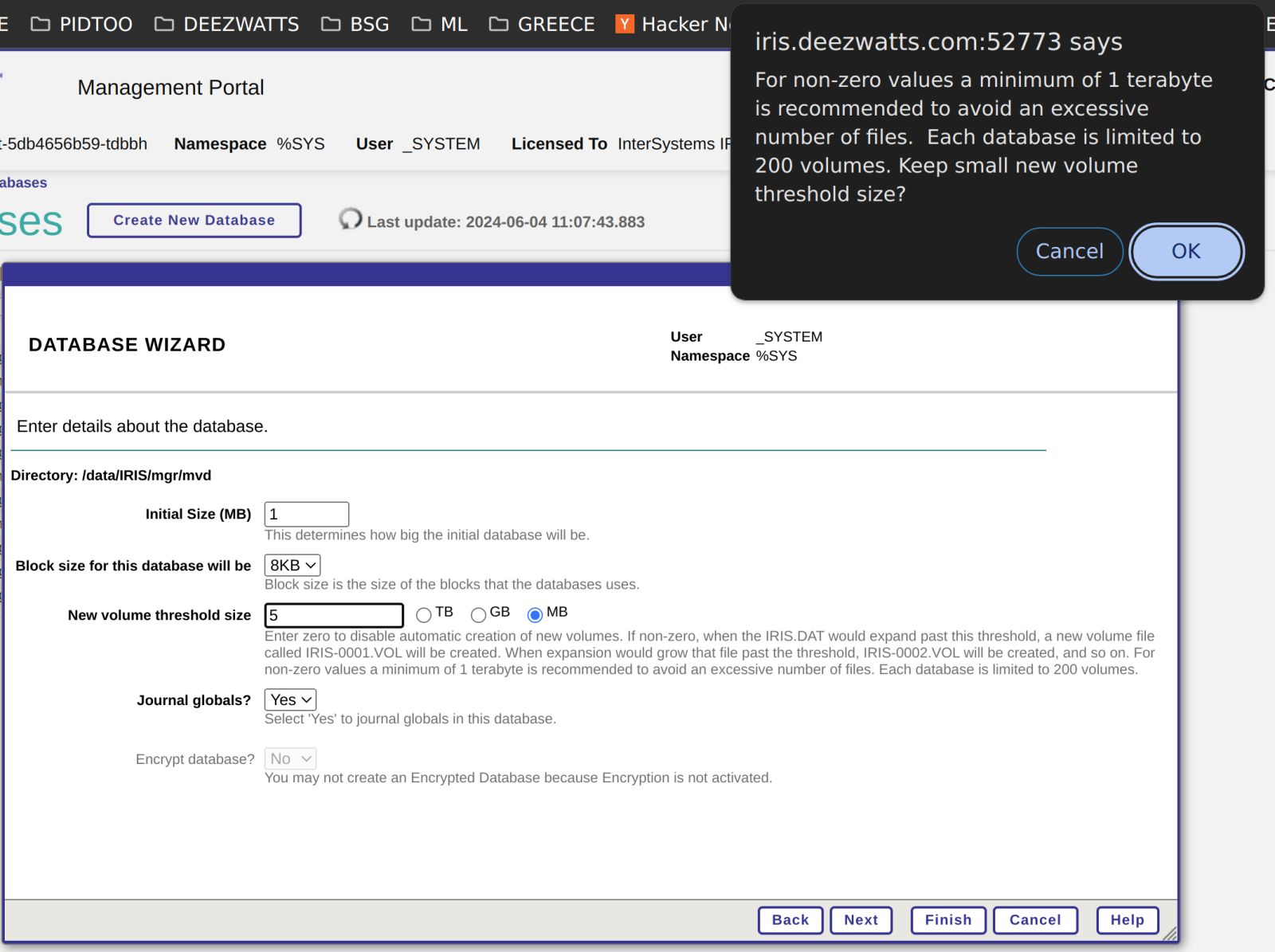 Para generar agotamiento de espacio en IRIS.DAT, añadí un namespace encima de la base de datos: