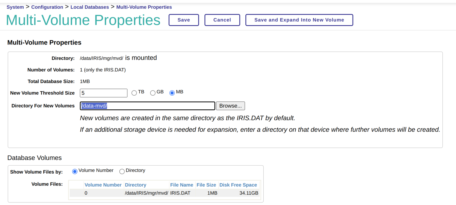 Por defecto, vuestra base de datos en IRIS utiliza un único archivo IRIS.DAT. Podéis configurar vuestra base de datos para que se expanda automáticamente en volúmenes adicionales (IRIS-0001.VOL, IRIS-0002.VOL, y así sucesivamente) al alcanzar un umbral de tamaño especificado. También podéis expandir deliberadamente vuestra base de datos en volúmenes adicionales. Los volúmenes adicionales pueden residir en el mismo directorio que IRIS.DAT y/o en un conjunto de directorios adicionales.