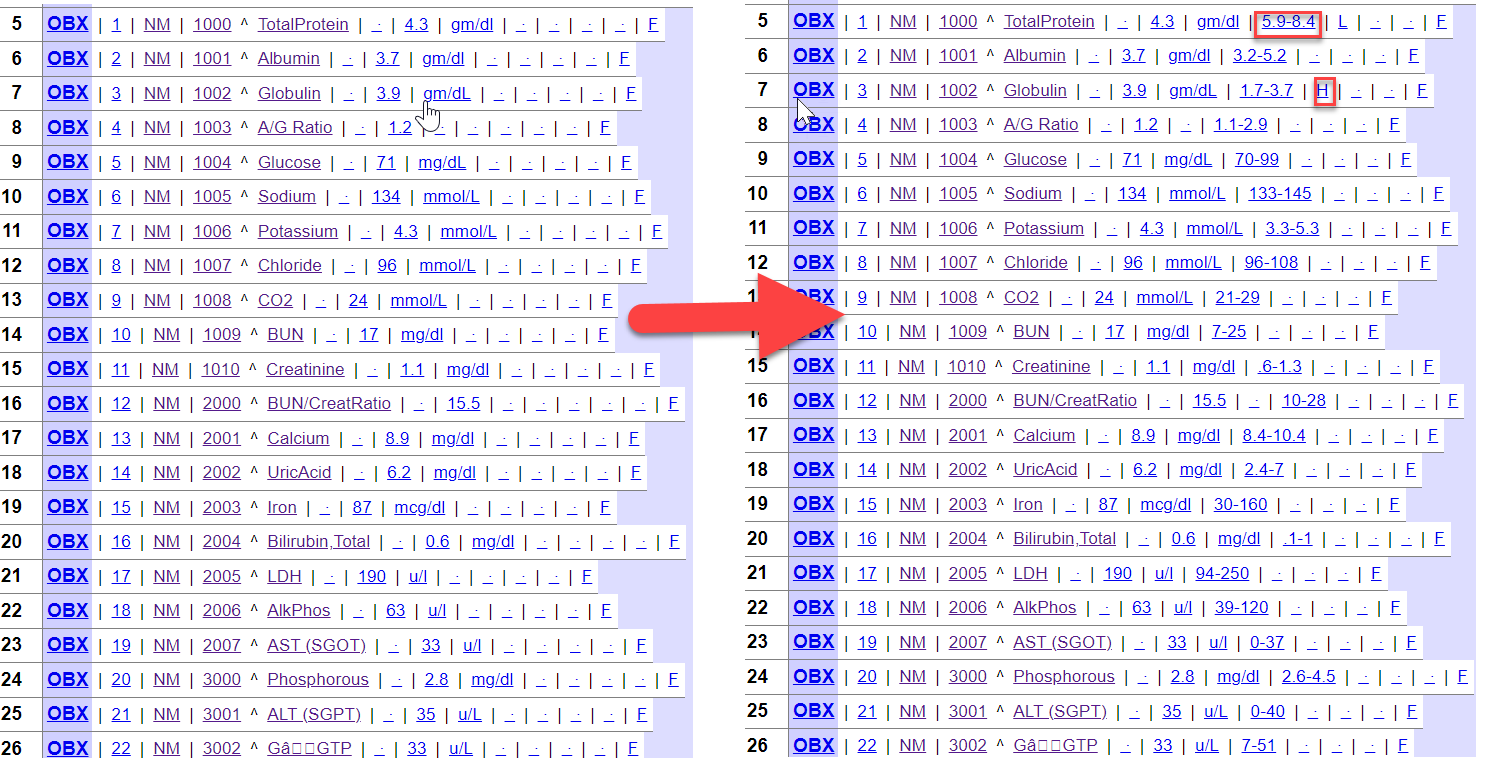 Ten en cuenta que para obtener el aviso de valor anormal (Abnormal Flag), tenemos que pasar OBX: Valor de observación (Resultado) junto con OBX: Identificador de observación (Código de prueba).
