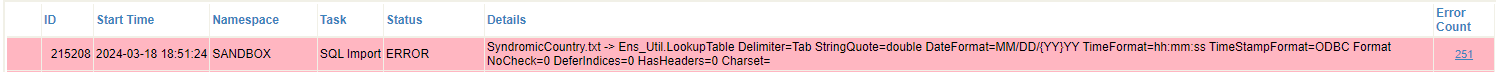 Por diversión, ejecuté el asistente nuevamente con el mismo archivo en el mismo namespace. Aquí podemos ver que hubo 251 errores y, de nuevo, podemos investigar más a fondo