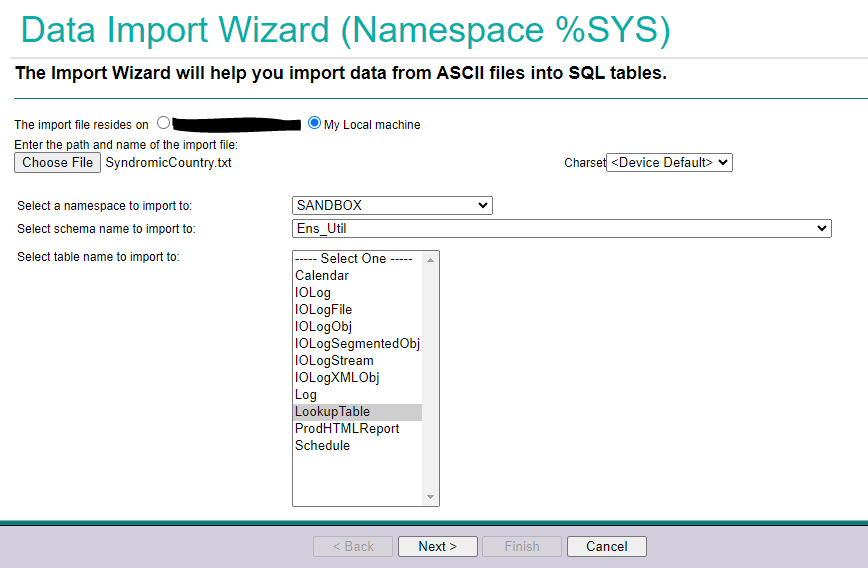 Aquí podéis navegar a la ubicación de importación/exportación en el servidor de vuestra instancia de IRIS o podéis navegar a la ubicación del archivo en vuestra máquina local. Como se mencionó anteriormente, usaré el archivo que almacené en mi máquina local.