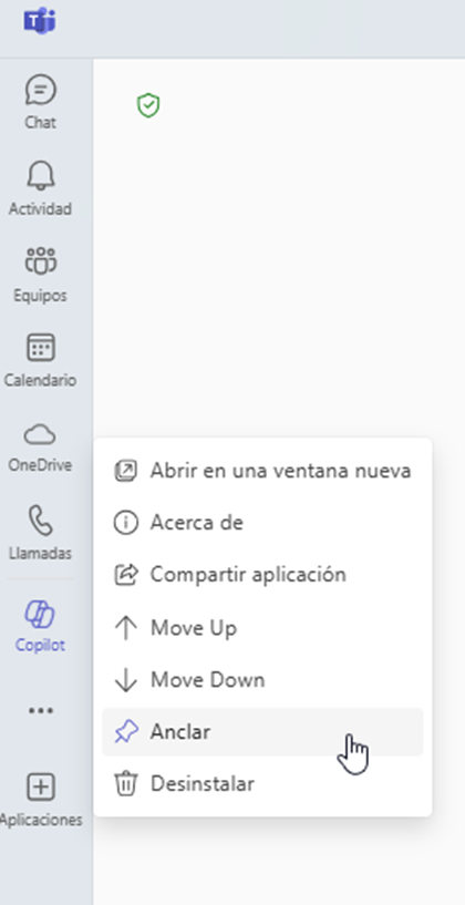 Haz clic derecho sobre el ícono de Copilot y selecciona Anclar para tenerlo siempre disponible cada vez que abras Teams.