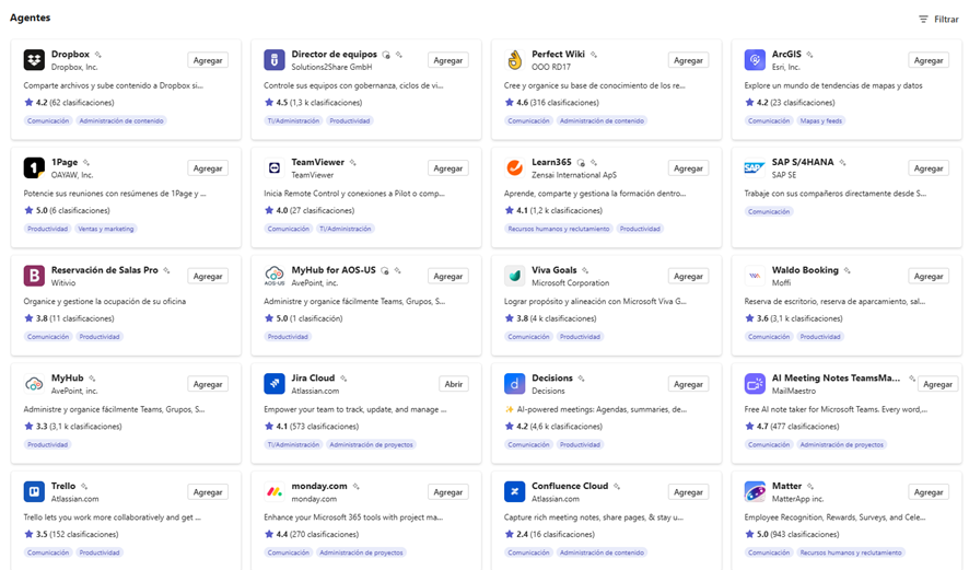 Date una vuelta por los agentes predefinidos; seguramente encontrarás alguno muy interesante de alguna aplicación que ya estés utilizando, como Jira o Confluence.  Estos agentes son versiones especializadas de Copilot, diseñadas para interactuar con aplicaciones o servicios específicos. Cada agente está configurado para: