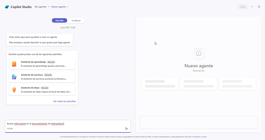 En ese momento aparecerá un menú donde podrás generar tu agente simplemente indicándole, con una breve descripción, qué quieres que haga