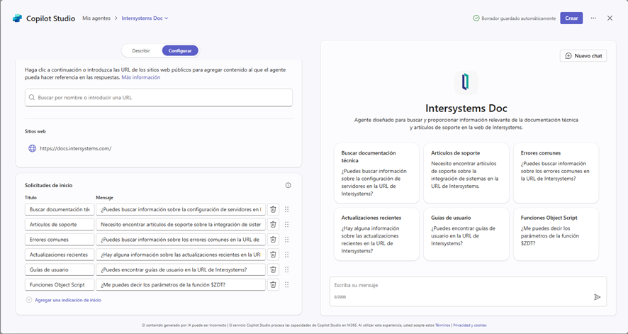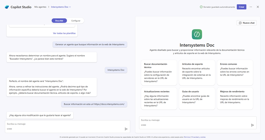 Os pongo unos ejemplos prácticos de los dos agentes que tengo actualmente en mi Copilot: uno obtenido directamente de los predefinidos y otro que os enseñaré a crear para Intersystems.