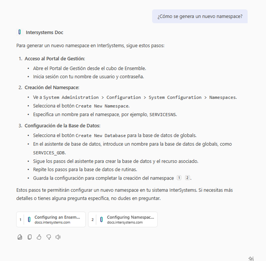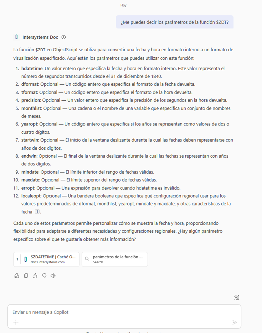 Si todo está configurado correctamente, el agente te mostrará la información correspondiente de la documentación y, además, te propondrá un enlace directo a la documentación oficial de Intersystems de donde ha obtenido la información.