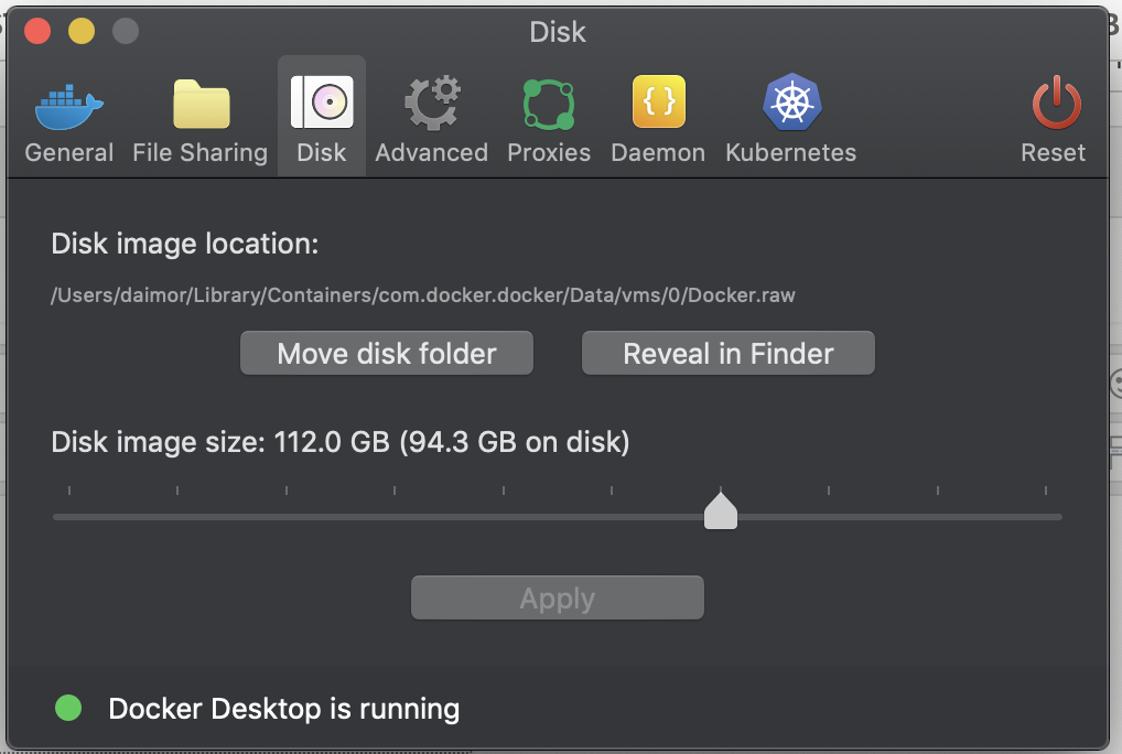 Cuando Docker se incluye en Linux, por defecto funciona en el mismo sistema de archivos. Pero en Windows y macOS, funciona en una pequeña máquina virtual con su propio Linux dentro. Y el espacio del disco está limitado por mi configuración en Docker. En mi caso, lo configuré para utilizar hasta 112 GB.
