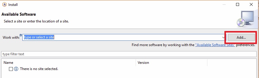 - En la ventana, "Available Software", pulsar "Add" in "Work with"