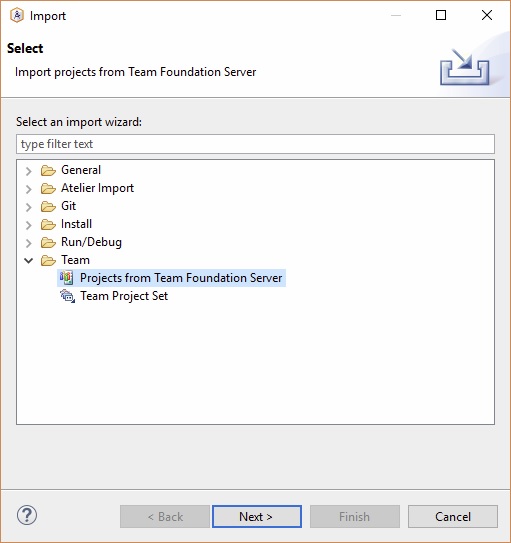- Desde el workspace, seleccionar la opción “Import” y seleccionar “Prohects From Team Foundation Server”