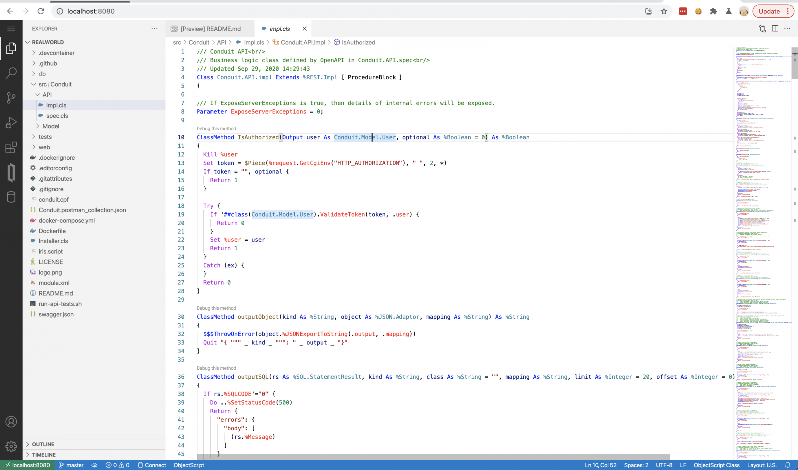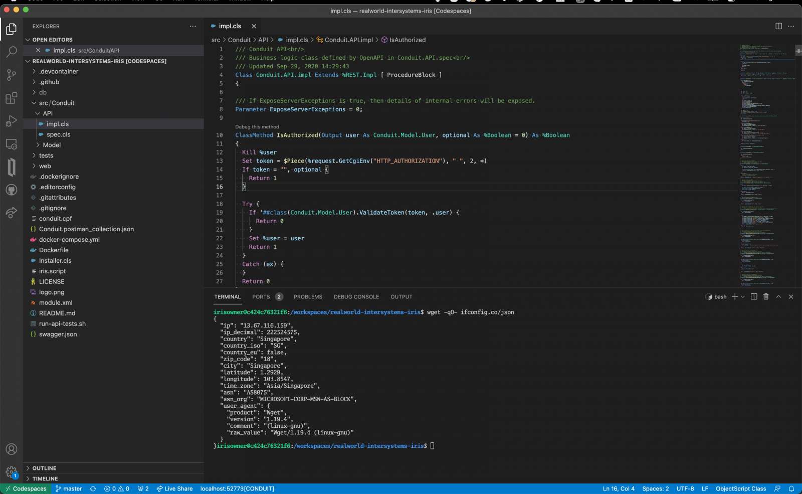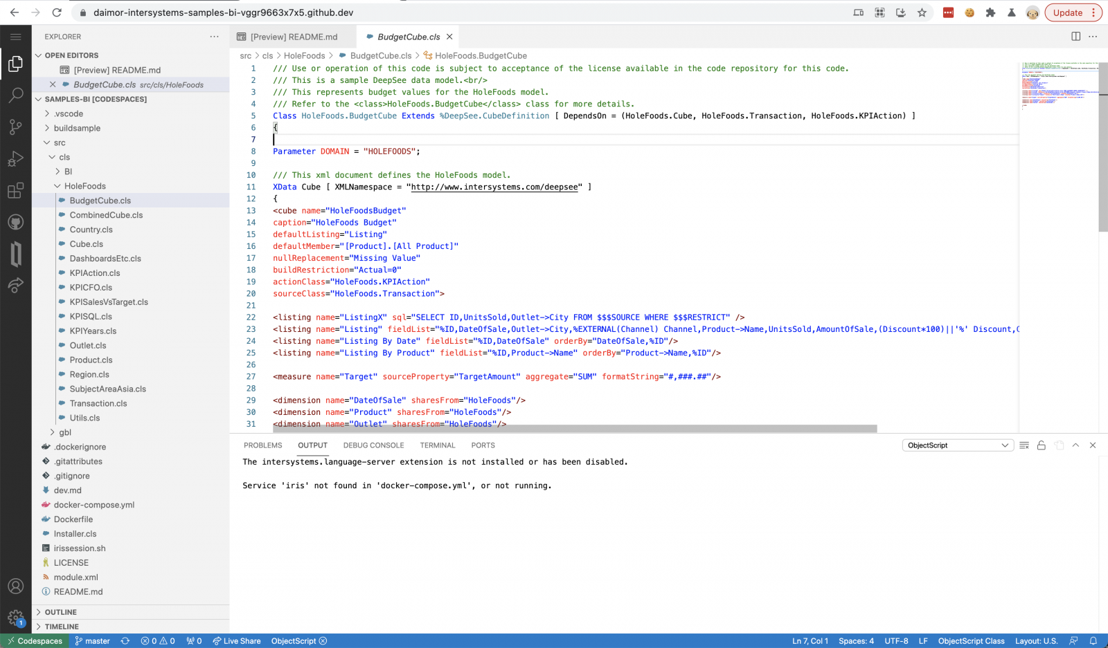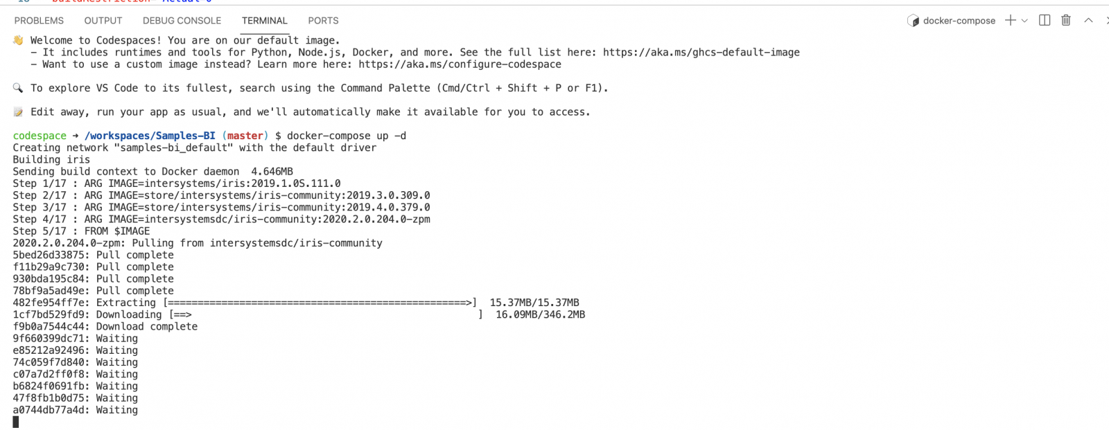 En mi caso, en el uso anterior de codespaces, ya había instalado la extensión ObjectScript y la había habilitado de forma global mediante línea de comando desde Codespaces. Por lo tanto, me lo instala cada vez, y el código ObjectScript ya se resaltó. Pero IRIS aún no está disponible. Empecemos con docker-compose.