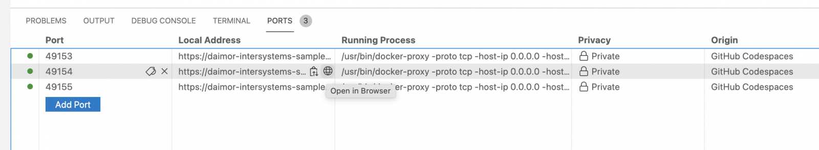 Los puertos de docker-compose se reconocen automáticamente y se pueden abrir en el navegador, por lo que también es posible abrir el Portal de Administración del Sistema
