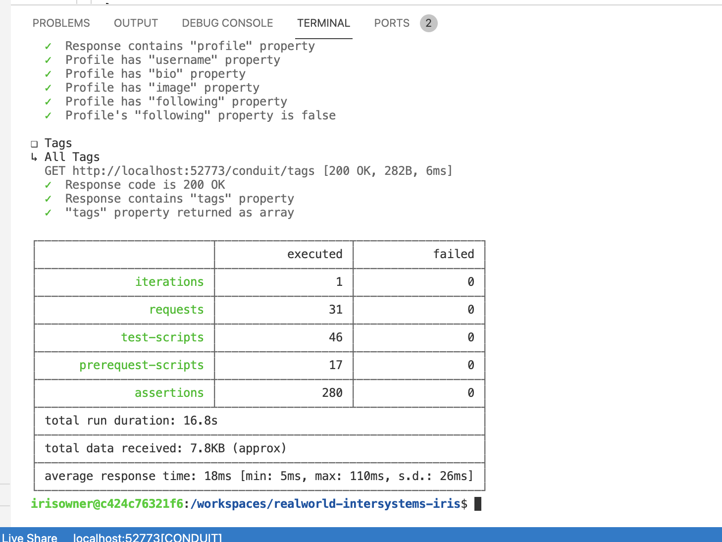 Este proyecto tiene una opción para probar la API REST con pruebas preparadas de Postman, así que he instalado npm y newman dentro del contenedor de backend con IRIS. Es posible realizar estas pruebas allí. Todo fue aprobado, bien hecho.