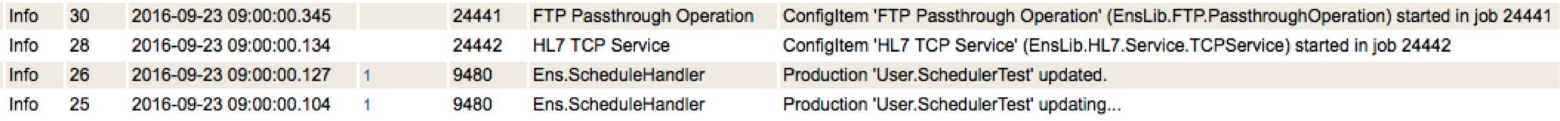 Ens.Alarm espera hasta las 09:00 y luego envía una respuesta. Ens.ScheduleHandler ve que son más de las 09:00 y que necesita iniciar tanto el servicio HL7 TCP como la operación de Passthrough de FTP. El visor de mensajes no muestra elementos de seguimiento que muestren que los componentes se están iniciando porque los propios componentes realizan el registro en lugar de Ens.ScheduleHandler, pero puede verlo en el registro de eventos: