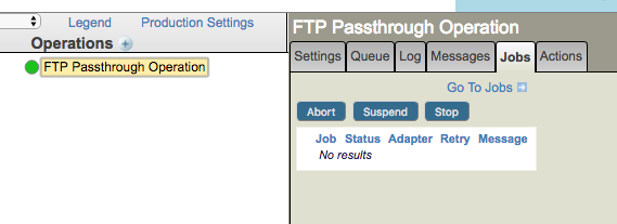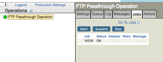 Tenga en cuenta que el color verde del componente muestra si está habilitado o inhabilitado, pero no indica si se inició. Si el programador de Ensemble detuvo la operación de paso a través de FTP (por ejemplo, justo después de las 15:00), Aún verá la operación mostrando un círculo verde, pero no habrá procesos listados en la pestaña "Procesos":