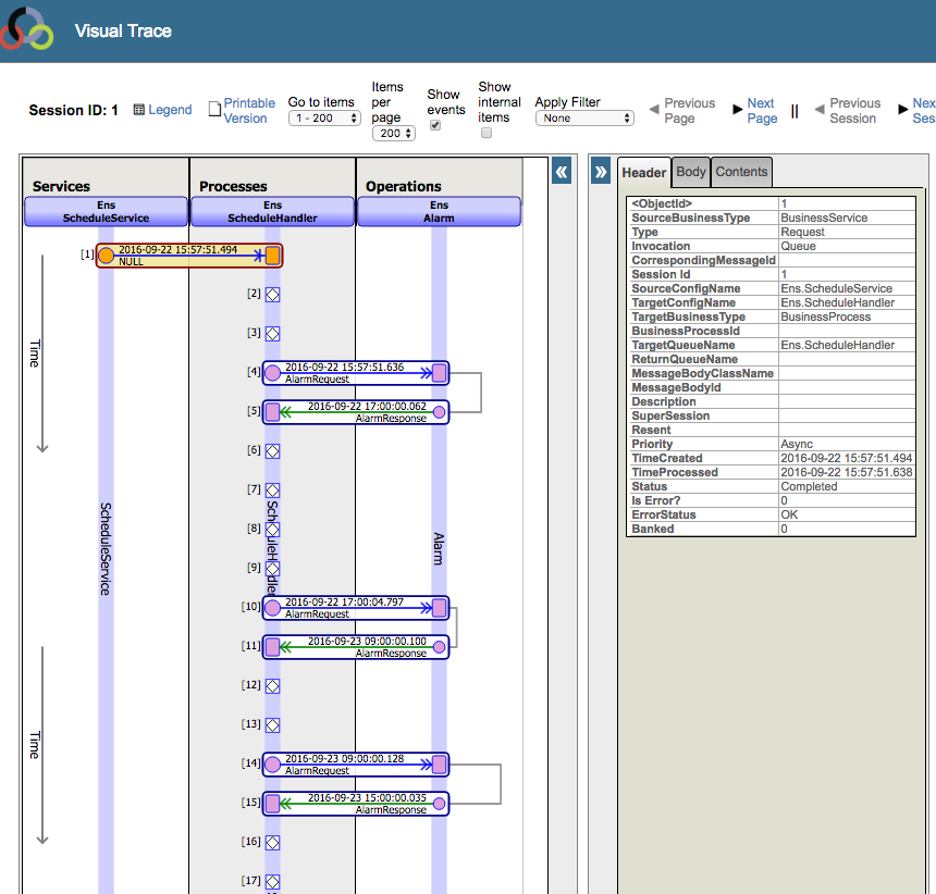 Para ver cómo funciona el programador de Ensemble "bajo el capó", mire el Visor de mensajes y verá una sesión que comienza con Ens.ScheduleService. Envía un mensaje a Ens.ScheduleHandler y, a partir de ese momento, mensajes entre Ens.ScheduleHandler y Ens.Alarm y viceversa. Este ir y venir continúa mientras la producción está en marcha.