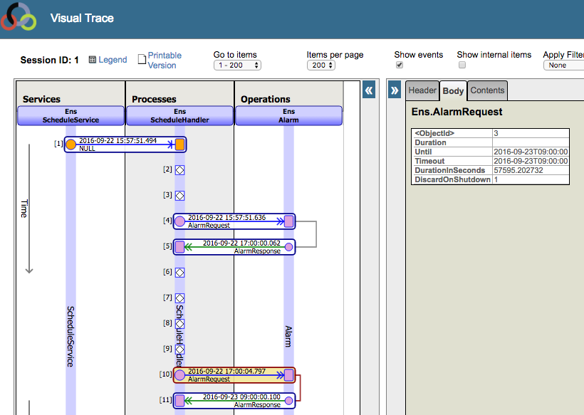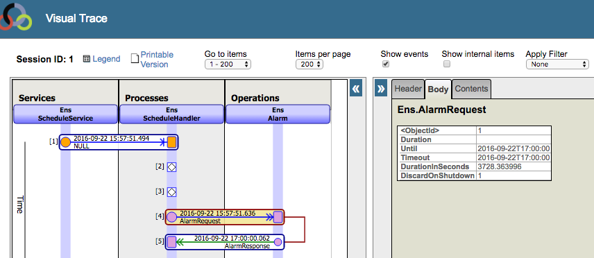 Si observa con atención el visor de mensajes de abajo, puede ver la marca de tiempo que muestra cuándo se estaba ejecutando Ens.ScheduleHandler: 15:57:51. En ese momento, la próxima hora programada es a las 17:00, por lo que envía un mensaje a Ens.Alarm que básicamente dice "Despiértame a las 17:00":