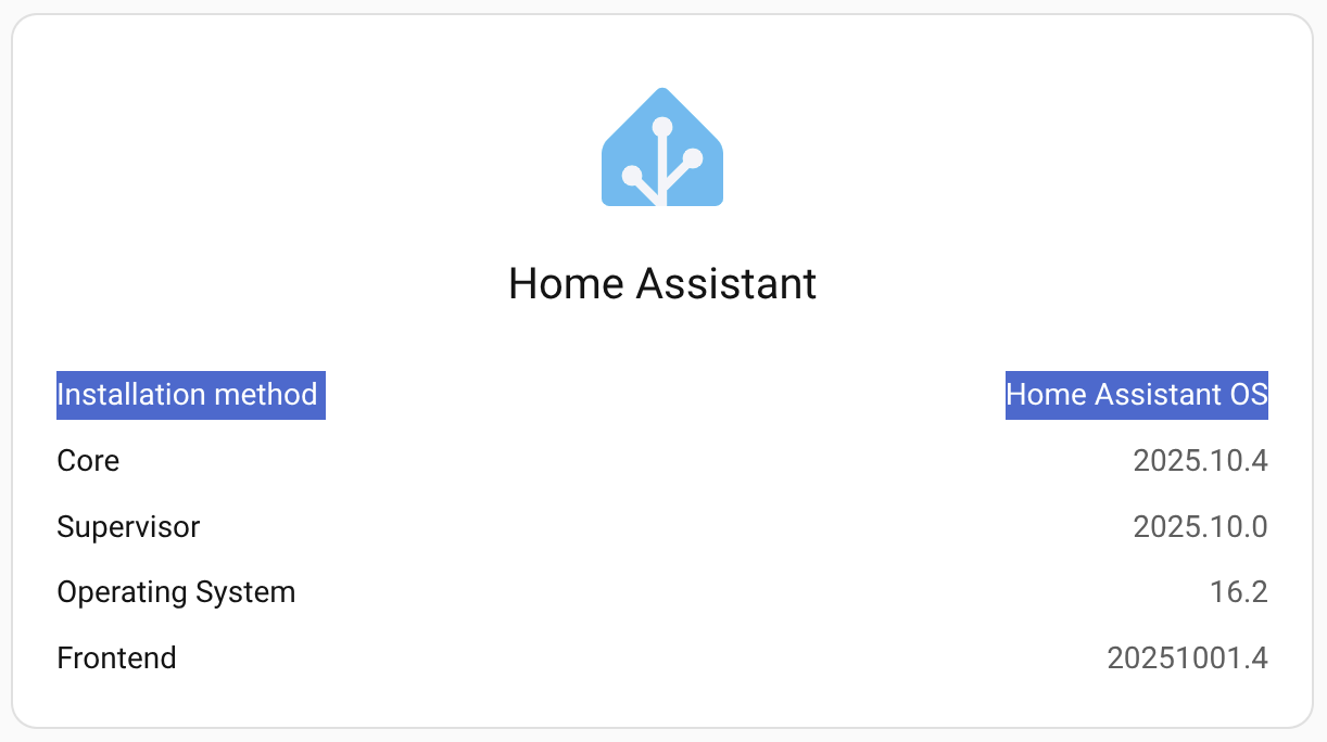 Estamos ejecutando HAOS y hemos comprobado la ventana “Acerca de” para confirmar que nuestro método de instalación es “Home Assistant OS”.