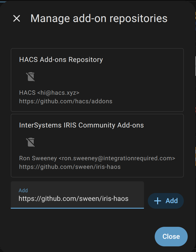 Ejecutad InterSystems IRIS dentro de Home Assistant, como un complemento. Antes de que descartéis este artículo pensando que se trata solo de una curiosidad, os invito a deteneros un momento y ver lo fácil que es lanzar aplicaciones basadas en IRIS usando esta plataforma. Si echáis un vistazo a Open Exchange, veréis decenas y decenas de aplicaciones que merecen ser utilizadas, pero que en la práctica quedan abandonadas como simples proyectos en Git, y que solo pueden ejecutarse si estáis dispuestos a enfrascaros en una batalla con containerd o Docker. Con un simple repositorio de Git y una especificación, ahora podéis construir vuestra aplicación en IRIS y hacer que se ejecute a través de un marketplace, reduciendo al mínimo las complicaciones para vuestros usuarios finales. Ejecutadla junto a Ollama y las implementaciones de LLM/LAM, exponed cualquier elemento de IRIS como un sensor o cread un endpoint para que vuestra aplicación en IRIS interactúe con cualquier cosa que tengáis conectada a HAOS. ¿Queréis reiniciar una producción de IRIS con solo accionar un interruptor físico o mediante una IA asistida? Podéis hacerlo con este complemento, o con uno propio, justo al lado de los entusiastas de la automatización del hogar.