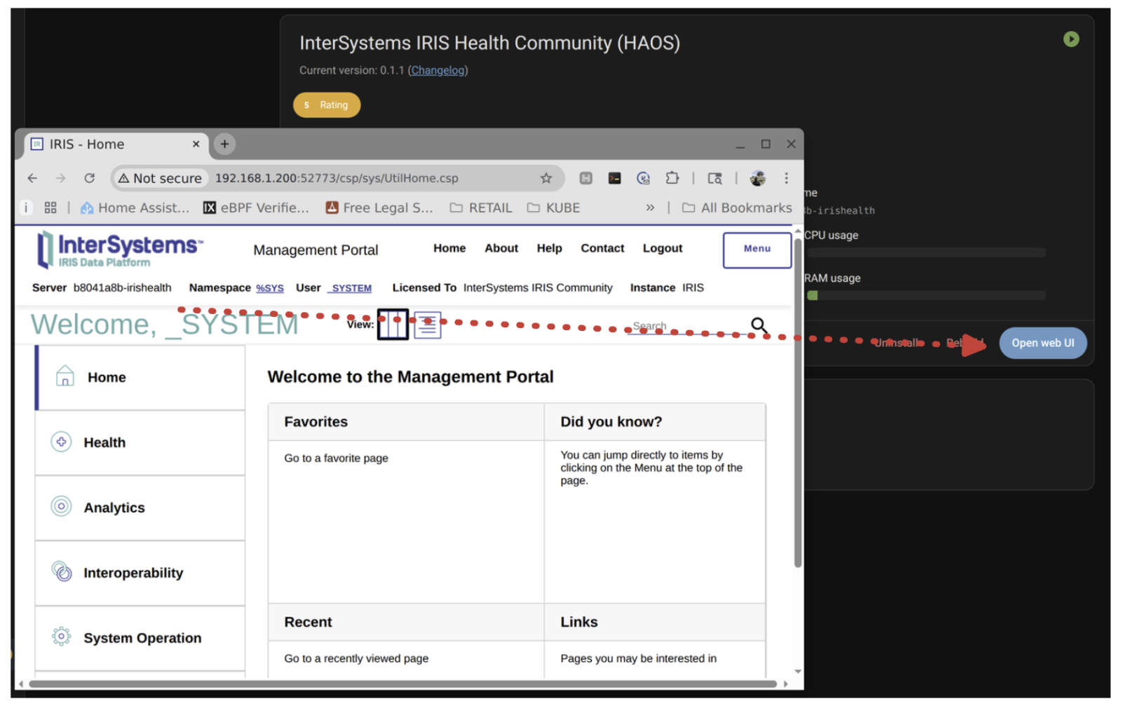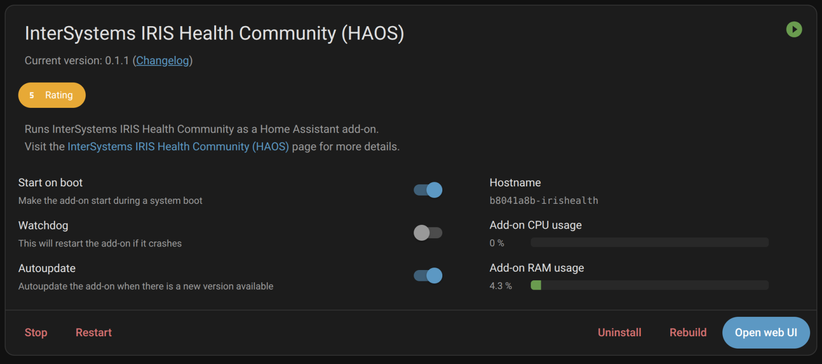 A continuación, pulsad el botón “Open Web UI” ¡y ya deberíais tener IRIS funcionando en HAOS!