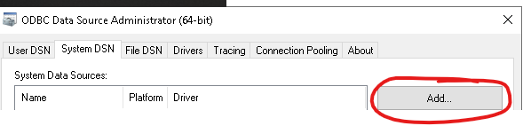 Paso 2: Id a la pestaña "System DSN" (DSN del sistema) y haced clic en "Add".