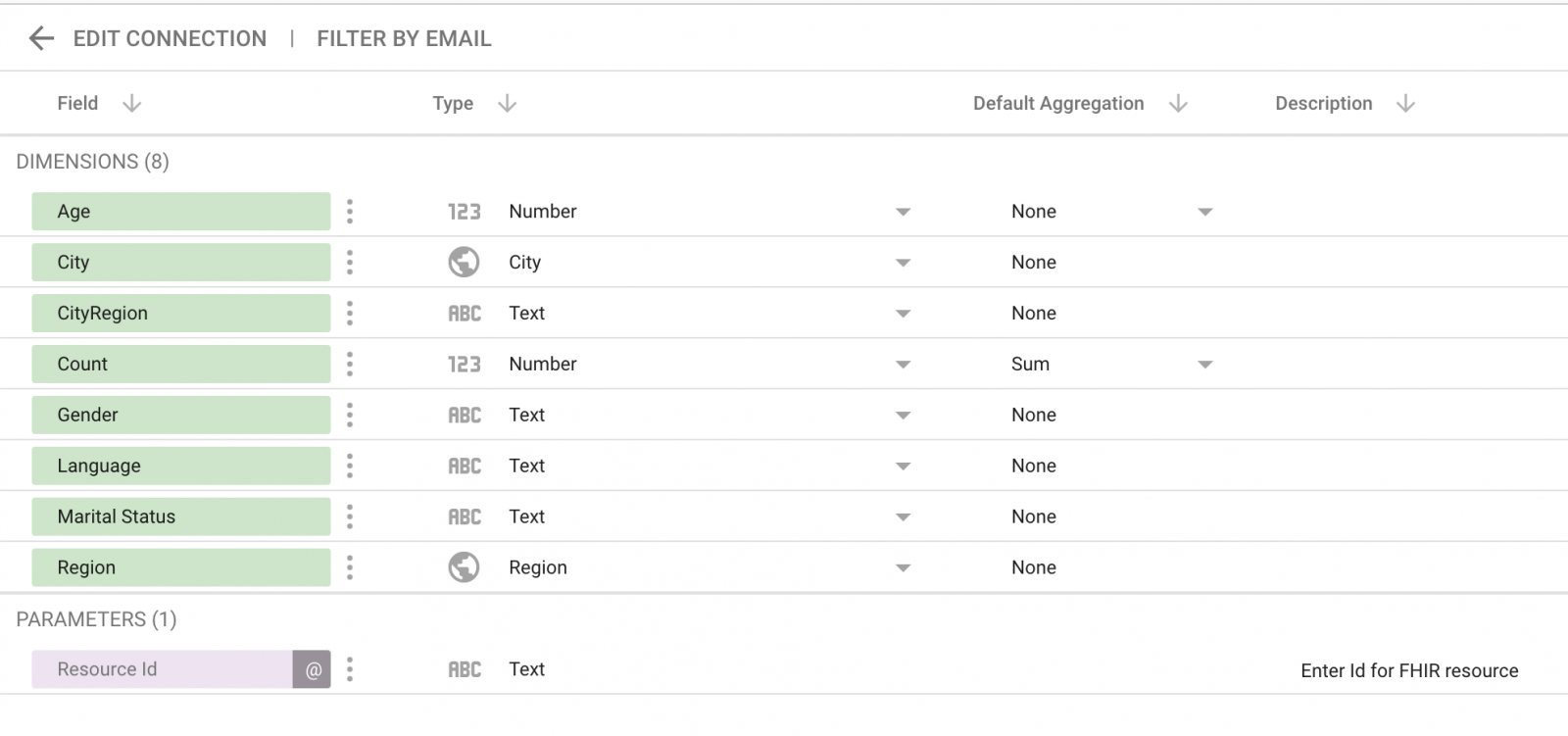 Haz clic en el botón Conectar, lo que te da aceso a la lista de dimensiones disponibles para el recurso seleccionado. Por ejemplo, Patient tendrá esto: