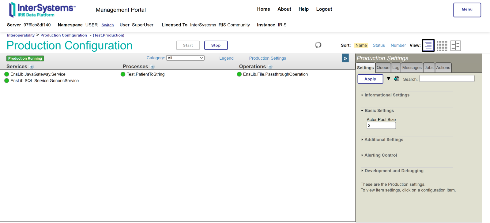 Finalmente, accediendo al portal de gestión de la instancia de IRIS, podremos revisar la producción en el Namespace USER que se carga por defecto, Test.Production: