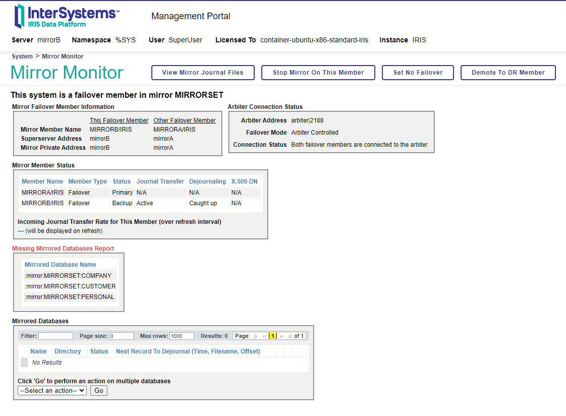 Los datos de la compañía se registrarán en la base de datos COMPANY y los del contacto en PERSONAL, ambas bases de datos están mapeadas para que puedan ser accesibles desde el Namespace PHONEBOOK. Si comprobamos las tablas en ambos nodos veremos que en mirrorA tenemos los datos tanto de la compañía como del contacto pero que el mirrorB aún no hay nada, como es lógico.