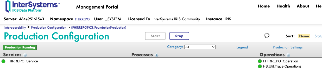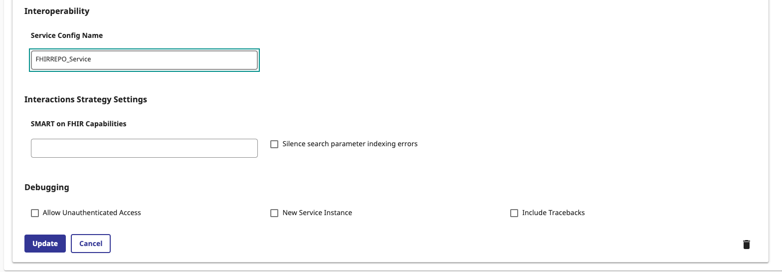 - HS.FHIRServer.Interop.Service, con la propiedad TraceOperations establecida a *FULL* y la propiedad Target Config Name con el valor del nombre de la operación HS.FHIRServer.Interop.Operation