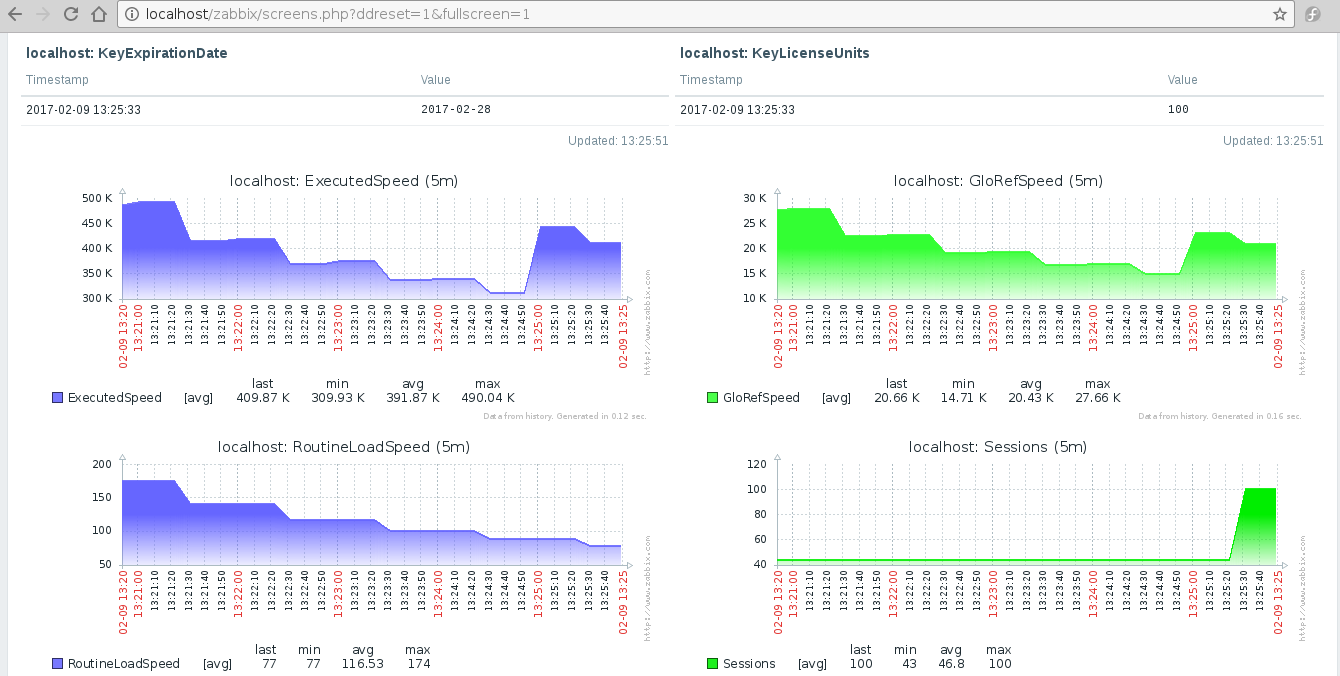Usaremos Zabbix. La documentación de Zabbix está aquí. Puede encontrar una guía detallada de instalación y configuración de Zabbix en Linux aquí. Se eligió Zabbix como un sistema que no solo le permite trazar gráficas, sino también supervisar texto simple (en nuestro caso, fecha de vencimiento de licencia y unidades de licencia). Después de agregar nuestras 6 métricas a los elementos de nuestro host local (escriba: SNMPv2 agent) y crear 4 gráficas y 2 parámetros de texto simple (como elementos de pantalla), deberíamos ver la siguiente imagen: