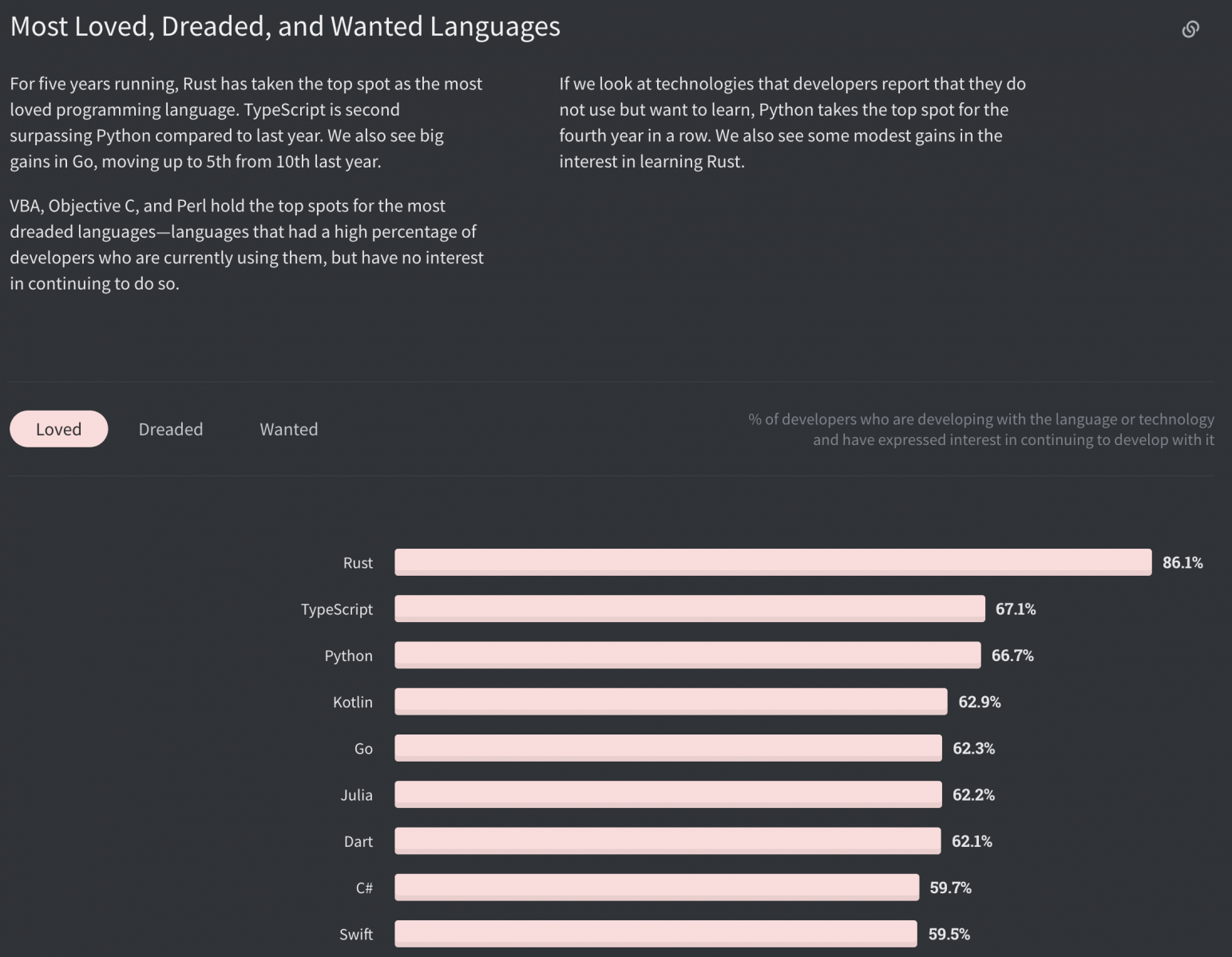 Es el lenguaje más valorado durante los últimos cinco años en la  encuesta de Stack Overflow 2020.