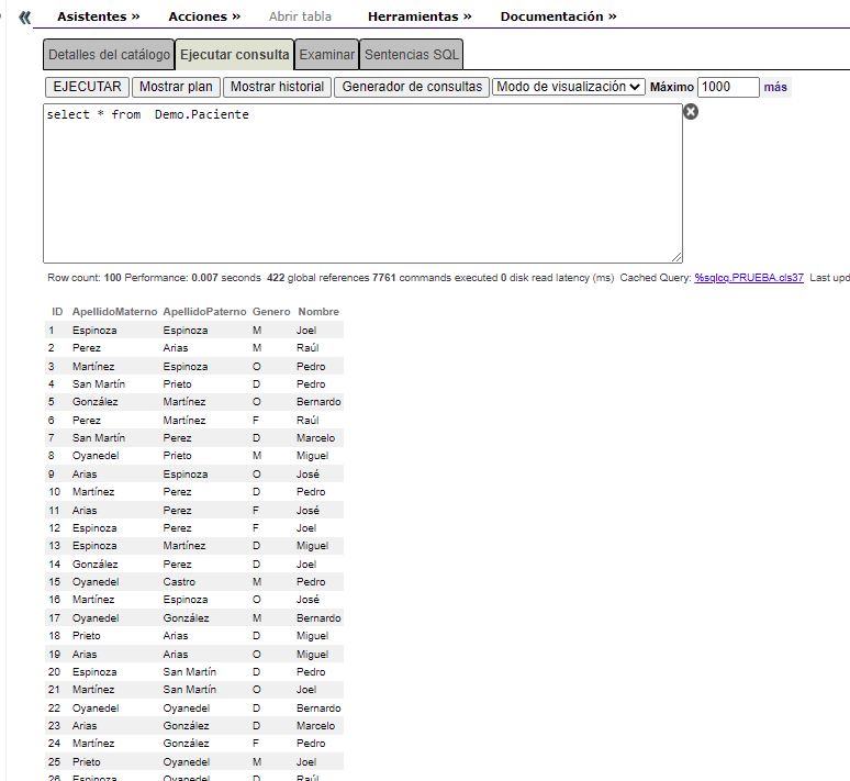 NAMESPACE>do ##class(Demo.Paciente).Populate(100)