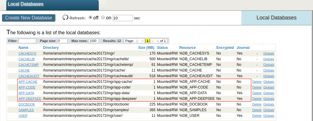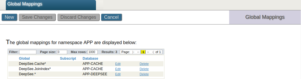 La siguiente captura de pantalla muestra los mapeos de esta implementación arquitectónica básica en el namespace APP. ^DeepSee.Cache.\* y ^DeepSee.JoinIndex mapean el caché de DeepSee hasta la base de datos APP-CACHE. Los globals de ^DeepSee.\* mapean, entre otras cosas, la implementación de DeepSee y la configuración hacia la base de datos APP-DEEPSEE. !
