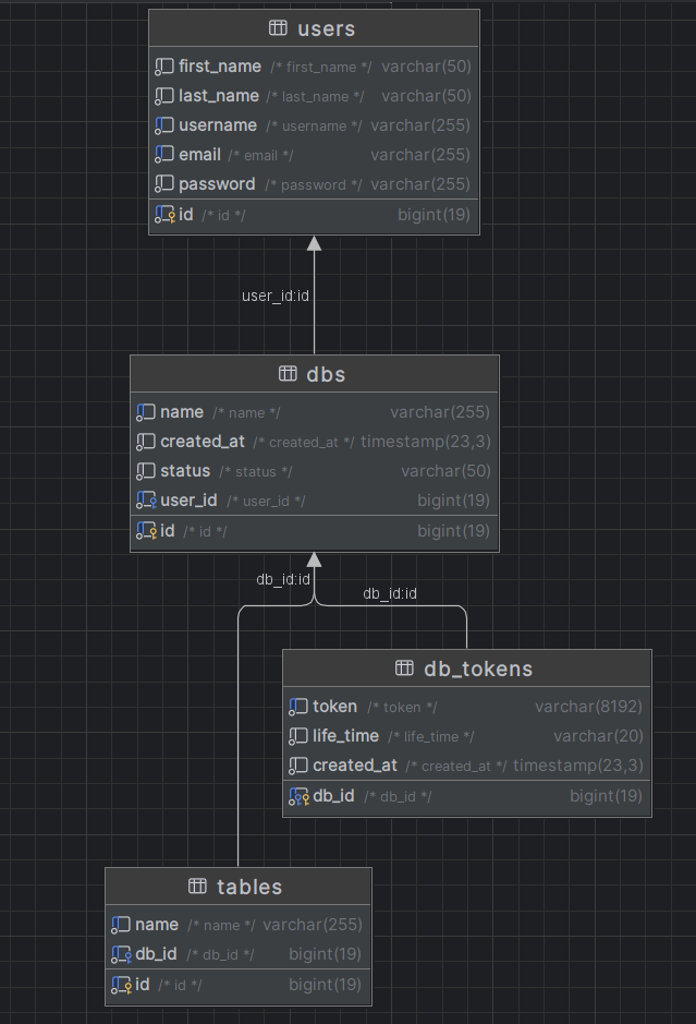 users. Esta tabla lleva un registro de todos los usuarios registrados, asegurando que cada uno tenga un identificador único para gestionar sus recursos. - Tabla de Bases de Datos (dbs): Cuando un usuario crea una nueva base de datos, los detalles de la base de datos (como su nombre) se almacenan en la tabla
