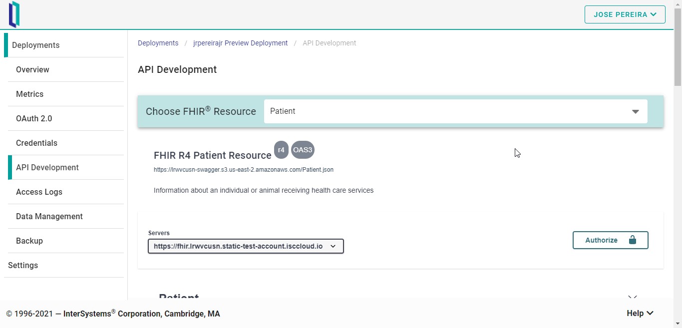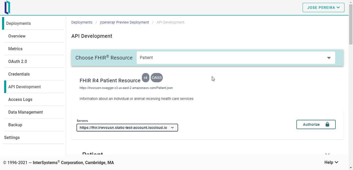 Para acceder a ella, haced clic en “API Development”. Cuando se haya cargado, podréis seleccionar qué recurso FHIR queréis explorar. Tened en cuenta que FHIRaaS ofrece la versión R4 para los recursos FHIR.