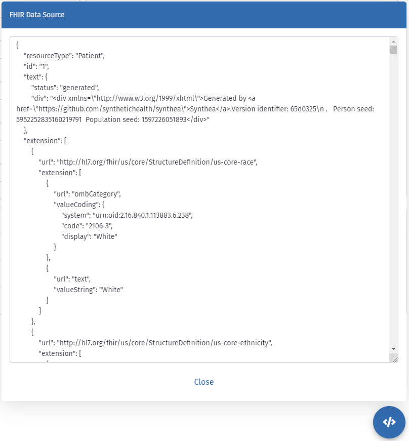 Para una aproximación transparente con datos del paciente, al final de la página hay un modal con toda la información que ofrecen los recursos de FHIR.