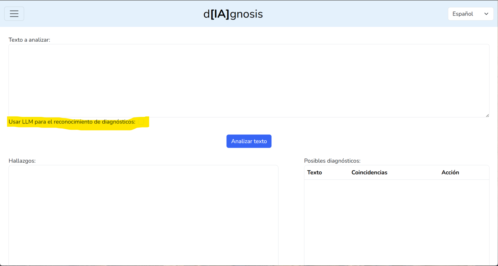 Para hacer uso de las capacidades de Ollama he modificado la pantalla que nos analiza los textos libres para indicarle que debe usar el LLM para extraer los diagnósticos del texto introducido.