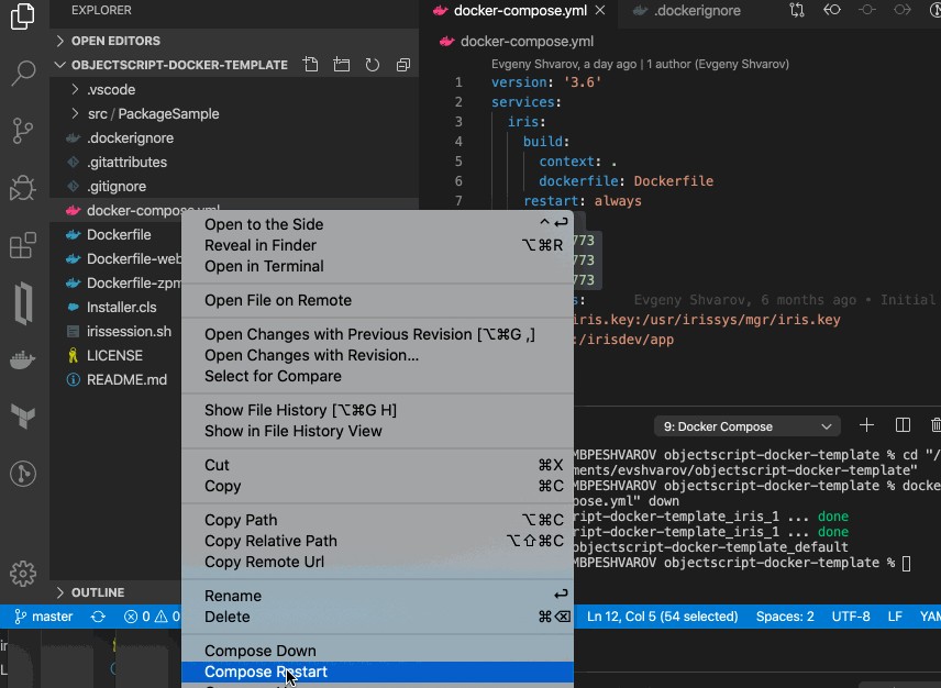 3. Haz clic derecho en docker-compose.yml->Reinicia - VSCode ObjectScript se conectará automáticamente y estará listo para editar, compilar o depurar